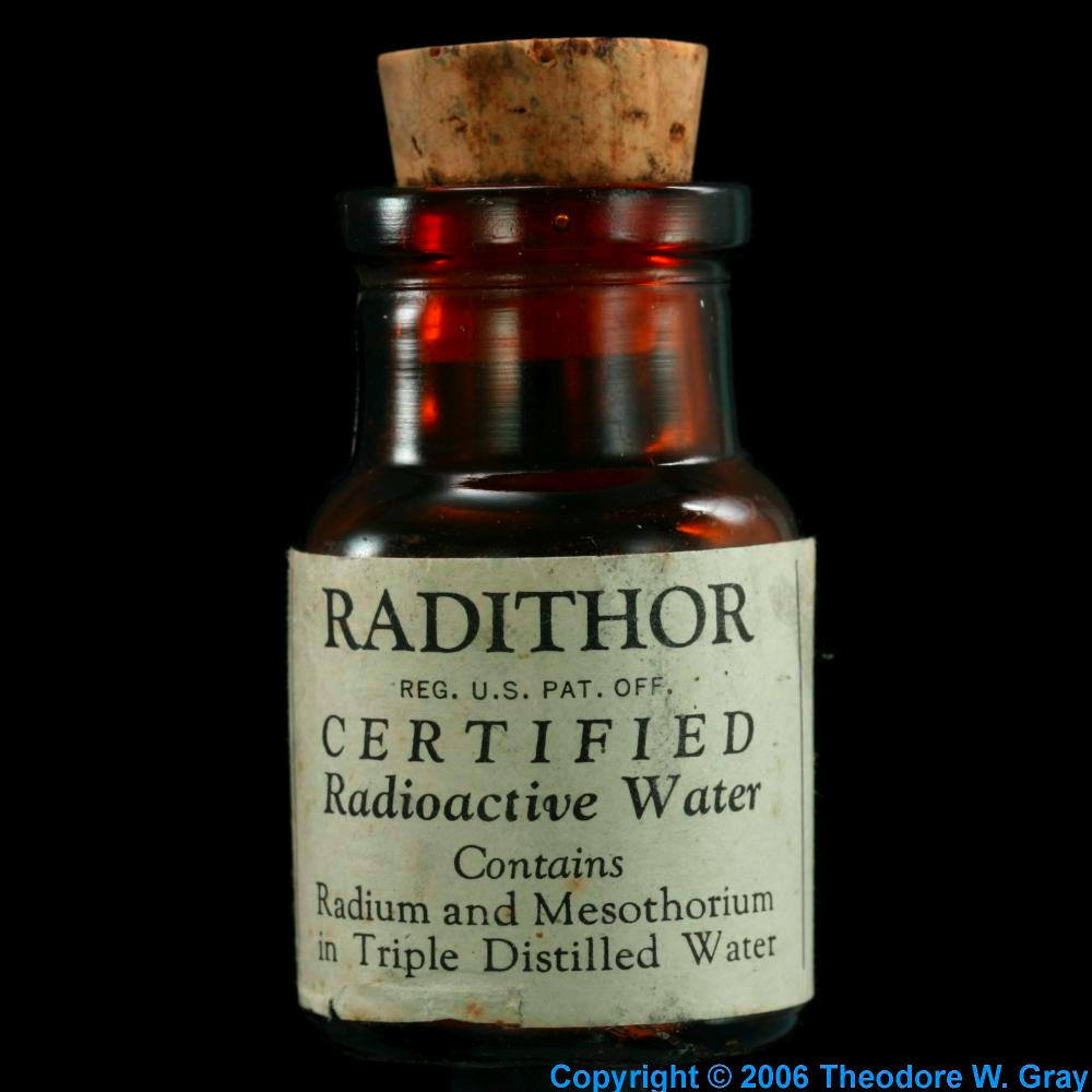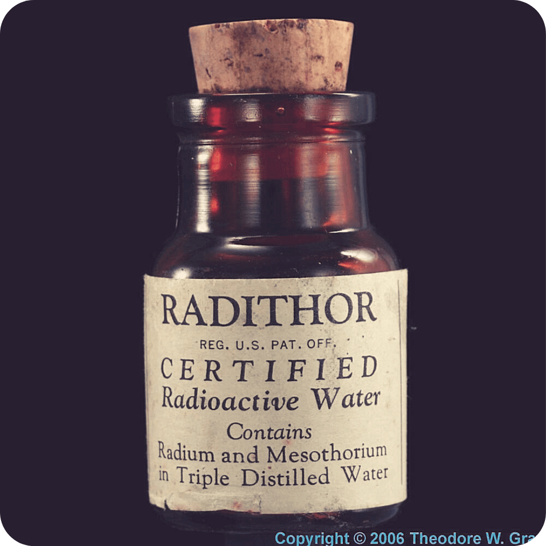 Uno degli esempi più lampanti di questa moda fu il Radithor, un antenato dei moderni energy drinks, il cui produttore, il sedicente medico William John Aloysius Bailey (possessore di una falsa laurea in medicina e di un dottorato a Vienna altrettanto falso), millantava essere la soluzione a svariate malattie: dalla dispepsia, all’impotenza, includendo oltre 150 patologie endocrine e molto altro ancora.